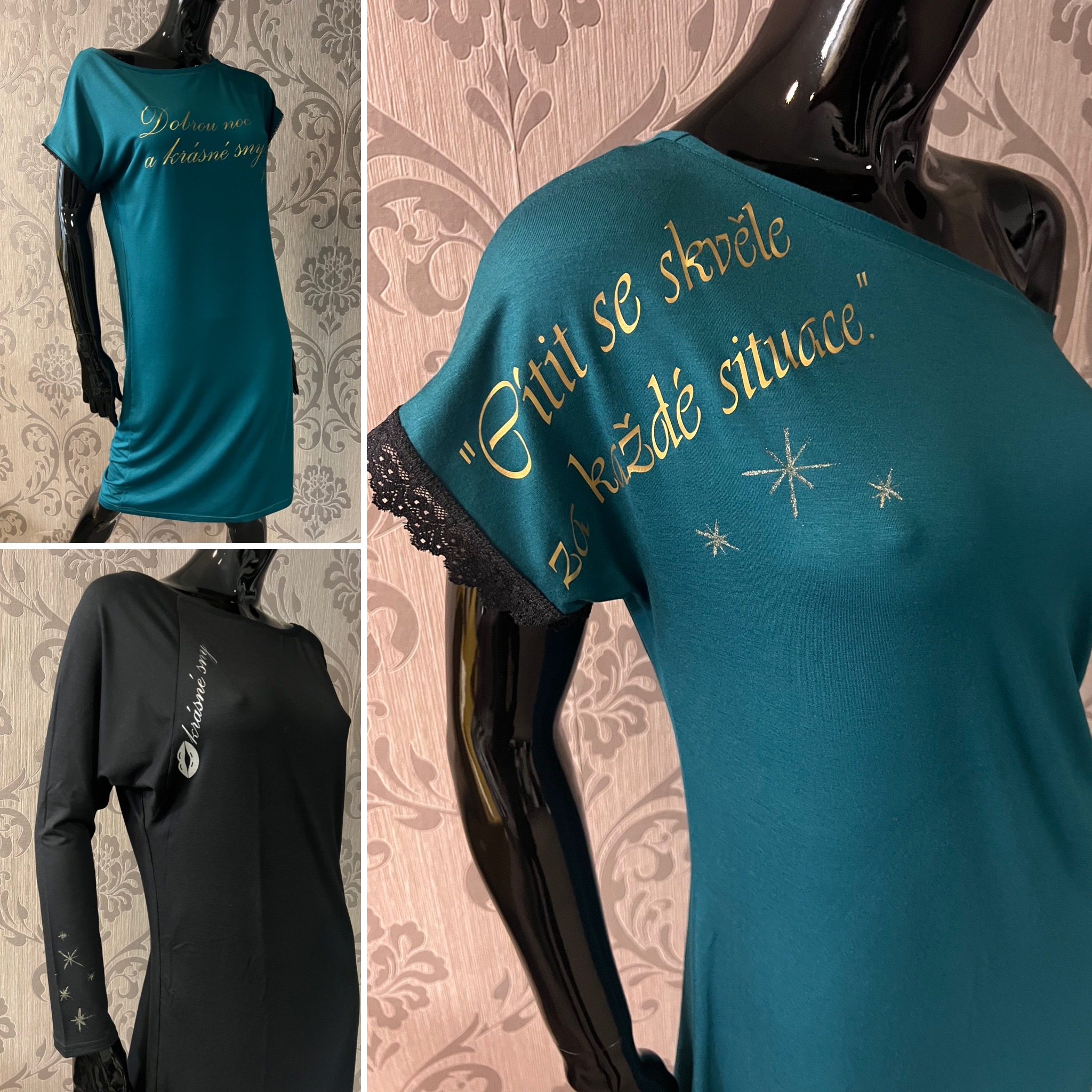 v rámci předvánoční akce na salonu 23. 11. 2023 jsem představila tipy a možnosti, čím obdarovat svoje blízké. I letos zůstávají ikonické IP šátky a ikonická IP trička. Ty se dají pořídit nově také s oblíbeným výstřihem do V. Což je oproti loňsku novinka. Nesmím ale především zapomenout na to, co máte nejraději. Na nějaká ta pyžámka. Zůstavá klasická verze kraťásků s tričkem. Ale nově letos pro Vás mám noční košilky z příjemného viskozového úpletu v černé a petrolejové barvě, ve všech dámských velikostech, s krátkým nebo dlouhým rukávem. Text můžete použít jakýkoliv co vidíte na fotkách, nebo si můžete zvolit svůj vlastní( jméno, monogram atd.). Můžete tak sladit celou svoji rodinu, ale i děti… Více už máte napsáno přímo v eshopu https://ivetadesign.cz/nabidka/